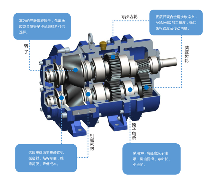 丝瓜视频18勿入的结构为自带减速齿轮的双支撑丝瓜视频18勿入,根据实际工况的不同亦可提供单支撑丝瓜视频18勿入。转子为高效的三叶螺旋转子,芯部为金属,外面可根据物料的不同包覆不同性质的橡胶。